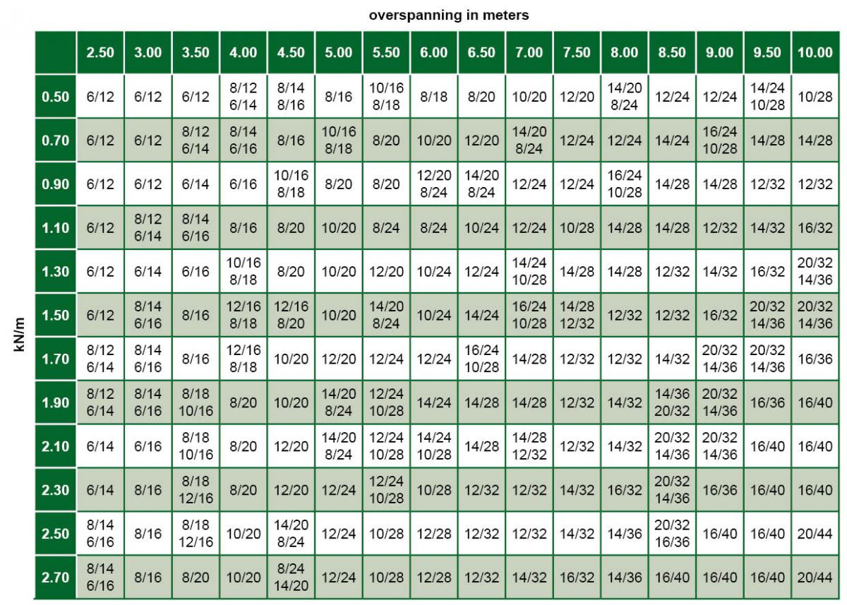 Tabel met overzicht overspanning in meters voor verlijmde balkenDeze tabel is indicatief en vervangt niet het statische bewijs